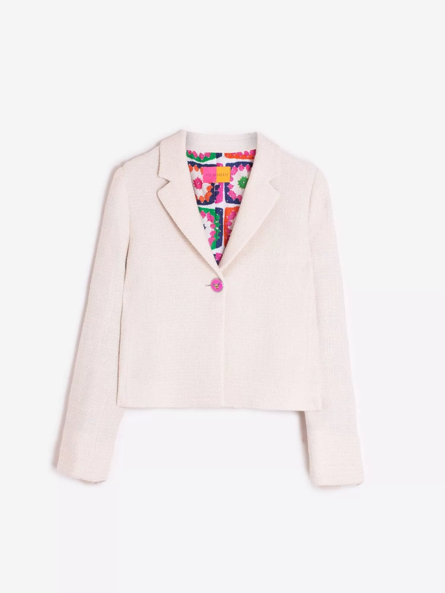 Chaqueta Corta Cruda De Algodón Con Botón Rosa Y Detalles De Lurex. Forro Interior Con Estampado Exclusivo Vilagallo. …